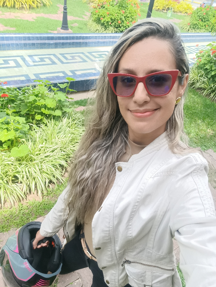 A female individual is depicted in a close-up, chest-up portrait, facing the camera with a slight smile in an outdoor park or plaza setting in Carrizal, Venezuela. She has long, wavy, light-colored hair and wears red, cat-eye style sunglasses, gold-colored circular earrings, a beige high-necked top, and a light beige utility-style jacket with brass-colored buttons and zippered pockets. A gold-toned belt is visible at her waist. Her right hand holds a motorcycle helmet, which is dark grey with pink and lighter grey striped accents, positioned in the lower left foreground. The background features a tiled water feature or decorative pool with a prominent blue and white Greek key pattern. Surrounding this feature are various green plants, including shrubs with red flowers and ornamental grasses, along with green lawn areas. A dark-colored lamppost is visible in the upper central background. The scene is illuminated by natural daylight.