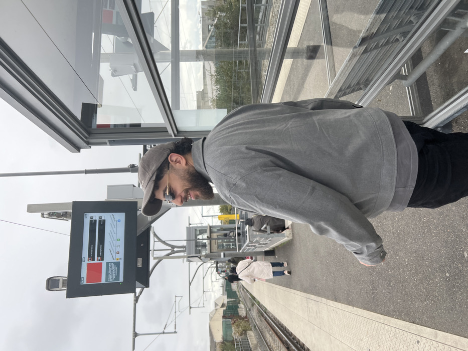 The image depicts a male individual on a Tramway T11 Express platform in Saint-Denis, France