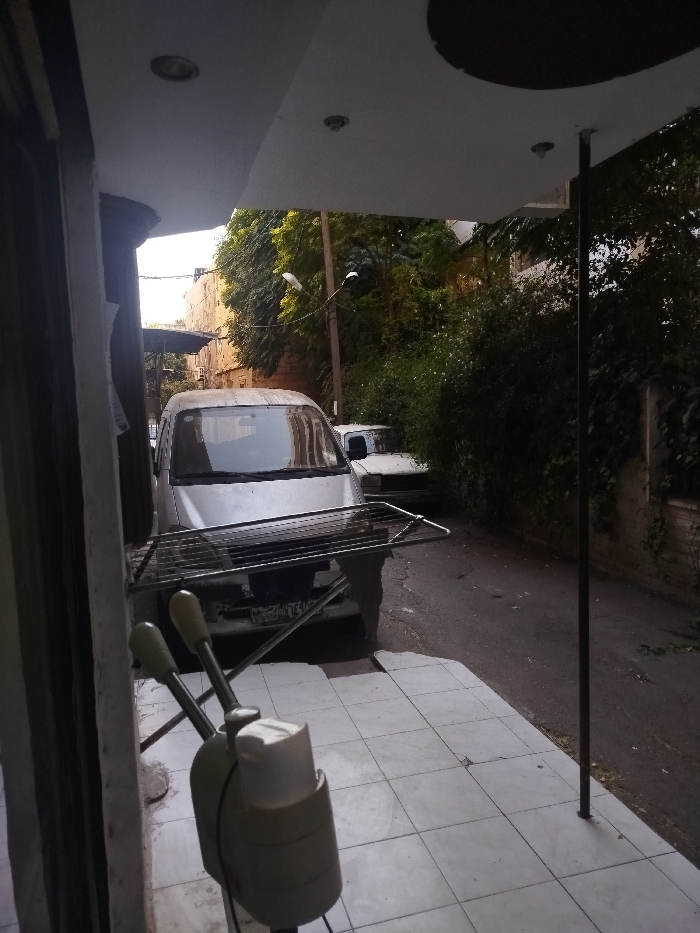 The scene depicts a narrow, asphalt street in an urban or semi-urban environment, viewed from a tiled outdoor area, possibly a porch or balcony, in the city of Unknown, Unknown. In the immediate foreground, a light-colored tiled floor is visible, along with a partially obscured cream-colored utility item featuring two upward-angled handles on the lower left. A silver metal clothes drying rack stands prominently in front of a parked silver minivan. The minivan, facing away from the viewer, occupies the left side of the street; its front bumper is partially hidden by the drying rack, and a license plate with non-Latin script is visible below. Behind the minivan, a white sedan is partially discernible, parked further down the street. The right side of the street is bordered by dense green foliage and trees, partially obscuring a brick wall. A utility pole with an attached street light is visible amidst the trees. On the left, behind the parked vehicles, a light-colored building is visible under a bright sky. No people are present.