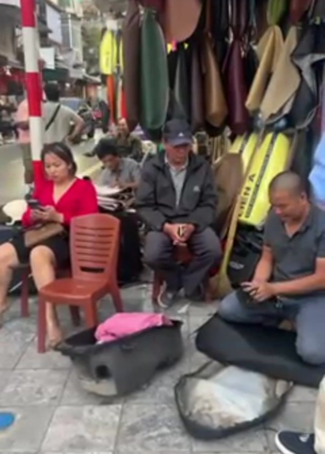 street scene where several people are gathered near a shop or stall selling leather goods. Hanging behind the group are numerous pieces of leather in various colors, including brown, green, and burgundy. A woman in a red blouse sits on a red plastic chair, looking at her phone. To her right, a man wearing a dark jacket and a baseball cap sits on a low stool, also looking at his phone. Another man, who is bald, kneels on a motorcycle seat, working on an object. In front of the group, there are two motorcycle-related items: a dark-colored container and another motorcycle seat. Other people are visible in the background, sitting and looking at papers. A street with passing traffic is visible in the background, and a street sign is visible on a striped pole.