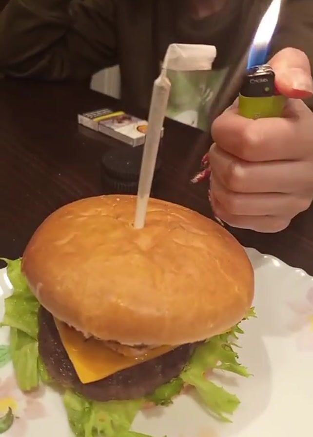 A video shows a burger on a plate being lit with a lighter. A person wearing a green sweater is sitting at a dark wooden table behind the burger. The person lights the white stick inserted in the top of the burger, creating a flame. The plate beneath the burger is white with a floral pattern. A pack of cigarettes, a lighter, and other small items are also visible on the table.