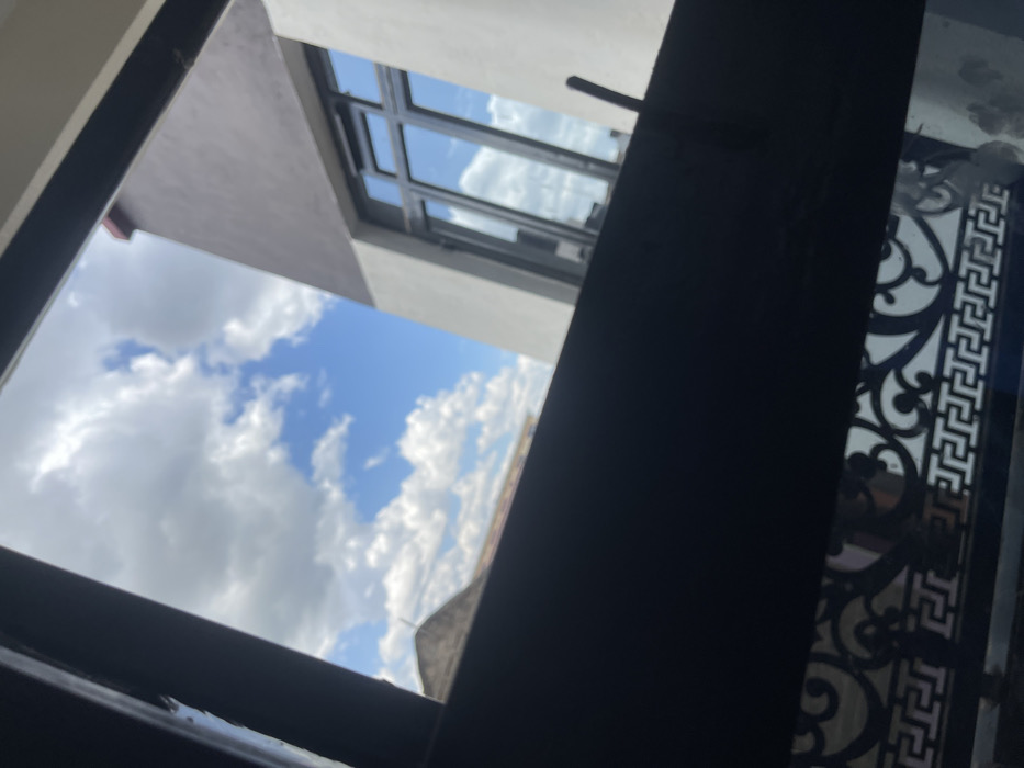The scene presents an exterior view observed through a shadowed window or opening in Thika, Kenya. The upper two-thirds of the image display a bright blue sky with numerous scattered white cumulus clouds. A modern building occupies the right side of the frame, featuring a light-toned facade, a contrasting darker brown upper section, and a large multi-paned window system reflecting the sky and clouds. Towards the left, the reddish-brown roof peak of an older building is visible against the horizon. A prominent dark horizontal structure, likely part of the immediate foreground's window frame or balcony, bisects the lower portion of the image. Below this, a black wrought-iron railing with ornate scrollwork and a repeating Greek key-like pattern is visible. No individuals are present or engaged in observable activities within the frame.