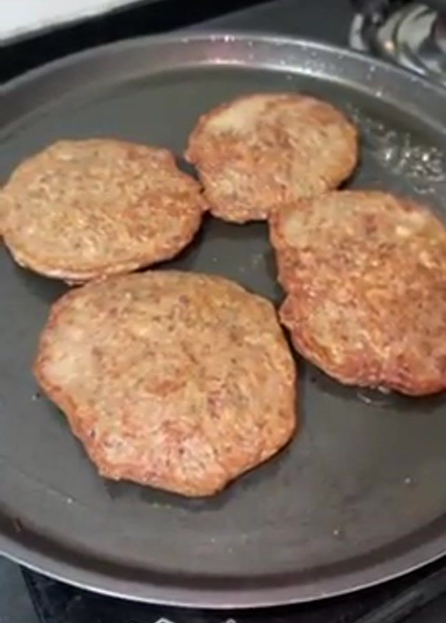 - "four burger patties cooking on a black non-stick pan sitting on a black glass stovetop" by FM-pp7Zj2, licensed under CC BY 4.0