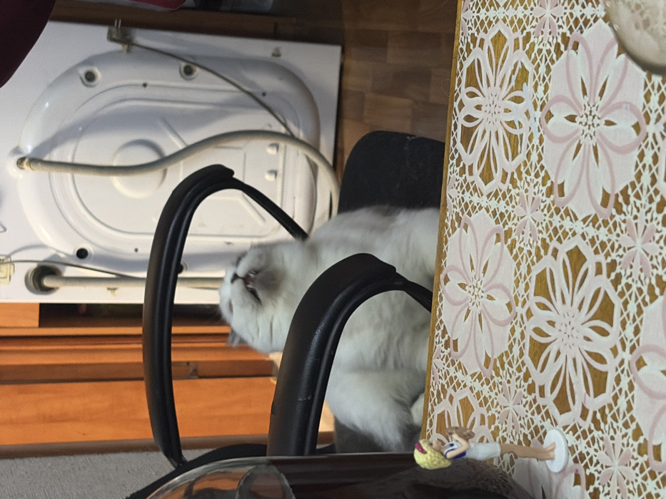 The image depicts an indoor scene within a residence in Chaikovsky, Russia. A white and grey cat is seated on a black office chair, positioned centrally. Its head is tilted upwards and backward, with its mouth open, exposing its upper teeth, consistent with a yawn or flehmen response. In the foreground, to the left, a dark glass bottle containing a red liquid is partially visible. Next to it, a small blonde female doll figurine, wearing a white skirt and a blue and white top, stands on a white base. These objects rest on a wooden table covered by a white, lace-style tablecloth featuring a repetitive pattern of large pink and smaller white floral designs. The background reveals the rear of a white washing machine, with a grey corrugated drain hose and another grey hose connected. An electrical cord from the machine is plugged into a wall outlet visible on the right. To the left of the washing machine, a light brown wooden door or panel is partially visible. The floor throughout the visible area consists of light brown wooden planks or laminate. No human subjects are present.
