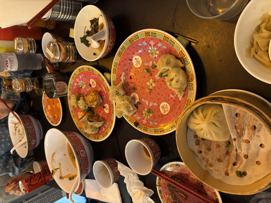 This image presents an overhead view of a dining table laden with partially consumed Asian cuisine, indicating a recent or ongoing meal for multiple individuals at what is likely an Asian restaurant in Paris, France, identifiable by the prominently displayed Evian water bottle. The black tabletop holds numerous dishes, predominantly featuring dumplings. Several red and white patterned ceramic plates, adorned with traditional Chinese characters and motifs, contain various types of dumplings, some appearing pan-fried (potstickers) and others steamed; many are partially eaten, with scattered green onion remnants. A bamboo steamer basket in the lower left foreground contains one intact, round soup dumpling. Additional dishes include large red and white patterned bowls with remnants of noodle soup or similar brothy dishes, each containing a white ceramic serving spoon. Smaller ceramic cups, some empty and others containing residual liquid, are interspersed among the larger items. Beverages present are a red Coca-Cola can and an Evian bottled water. Condiments are housed in multiple clear glass shakers with silver tops, holding dark liquids such as soy sauce, vinegar, and chili oil. A hand with painted fingernails and a portion of an arm, possibly clad in denim, are visible on the left side, one holding red-tipped chopsticks over a bowl. Crumpled white paper napkins and a tall, cylindrical metal container are also present on the table. A glass containing clear liquid is visible on the far right.