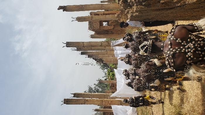 An outdoor scene in Jos, Nigeria, features a group of individuals in traditional attire set against a backdrop of ruined concrete structures