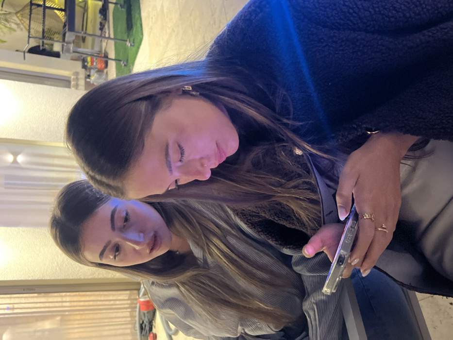 two young adult females in an outdoor or semi-outdoor residential setting at night, likely a patio or backyard. While the image contains no explicit visual cues to confirm the location as Rishon LeZion, Israel, it depicts a private residence. The female on the right, in the foreground, has long brown hair and wears a dark, possibly black, fuzzy jacket over a dark top. She has a small ring in her left nostril, earrings, and multiple gold-toned rings on her right hand, including one shaped like a butterfly or flower. She is intently looking down at a smartphone, held in a clear case with both hands, its screen emitting a blueish light that illuminates her face. Her expression is focused. The female on the left, slightly behind the first, also has long brown hair and wears a light-colored, possibly blue or grey, striped button-up shirt. She is looking towards the smartphone, her mouth slightly open, indicating shared attention or an interaction related to the device. The background includes a light-colored wall with two modern, wall-mounted outdoor lights casting warm light. To the far right, an area with artificial green turf and a black metal barbecue grill or outdoor stand is visible. To the far left, a large glass sliding door or window partially reveals an adjacent area, with a vacuum cleaner hose and a red bucket-like object resting near its base. The scene is illuminated by artificial light from the background fixtures and the smartphone screen.