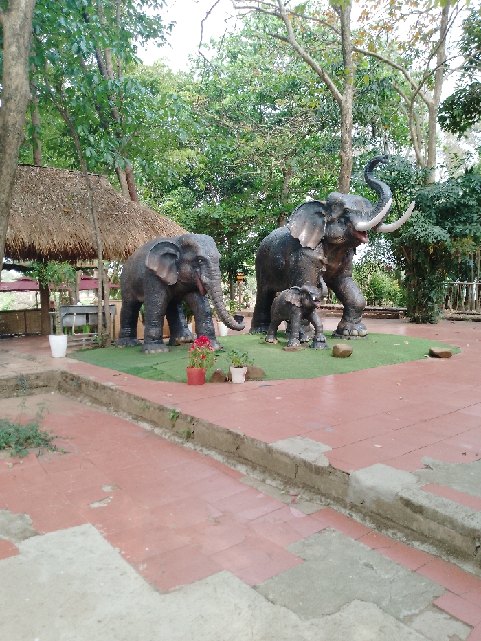 The image displays an outdoor scene featuring three dark grey elephant statues on an elevated patch of artificial green turf