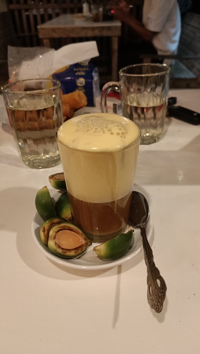 This image presents a detailed close-up of a tabletop scene in Pulorayeuk, Indonesia. The central object is a clear glass containing a layered beverage: a dark brown liquid base topped with a thick, pale yellow foam exhibiting small surface bubbles. This glass rests on a small white saucer. Arranged on the saucer around the glass are several segments of halved green fruit, displaying pale orange-brown flesh internally, consistent with young betel nuts. An ornate silver spoon with a decorative handle lies on the saucer beside the glass. To the left, a clear drinking glass holds water. To the right, a clear glass mug also contains water. Behind these, a black electronic device and a crumpled white tissue are visible. Further in the background, a white plastic bag partially conceals a blue-packaged item and several brown, fried food pieces. A person wearing a white short-sleeved shirt is partially visible in the deep background, with their arm and torso, suggesting a casual indoor or sheltered outdoor dining environment, likely a cafe or street food stall.