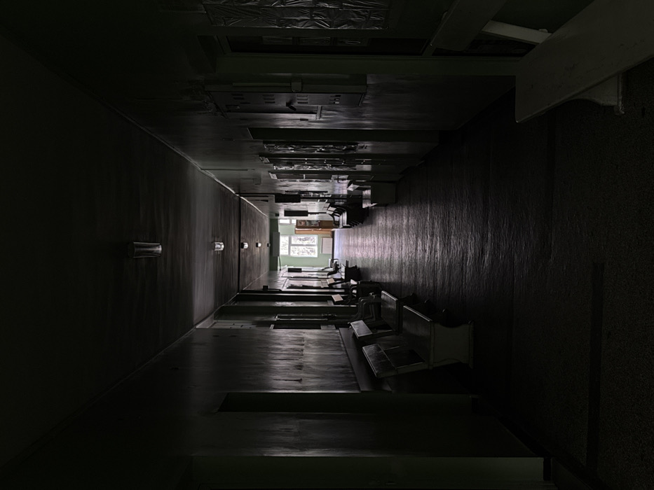 The image displays an interior view of a long, rectilinear corridor located in a building within the city of Goce Delchev, Bulgaria. The perspective is from a shadowed foreground, looking along the length of the hallway towards a brightly illuminated far end. The walls, appearing dark due to low ambient light, are lined with multiple recessed doorways or closed doors on both sides. A series of identical wooden benches, each featuring a light-colored frame and a dark seating surface, is positioned against both corridor walls, extending into the distance. The floor is dark and exhibits reflective properties, indicative of a smooth, possibly polished, surface. The ceiling contains evenly spaced overhead light fixtures, some visibly emitting light, contributing minimally to the overall illumination. Natural light streams from multiple large windows at the corridor's distant terminus, illuminating a cabinet or storage unit in that bright area. Several closed utility panels are affixed to the right wall. No individuals, active subjects, or discernible interactions are present in the scene, which appears unoccupied.