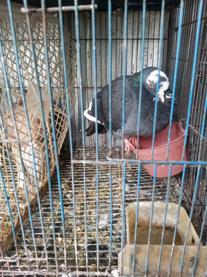 - "A pigeon with black and white plumage sits inside a blue-framed cage" by FM-YnnIF2, licensed under CC BY 4.0
