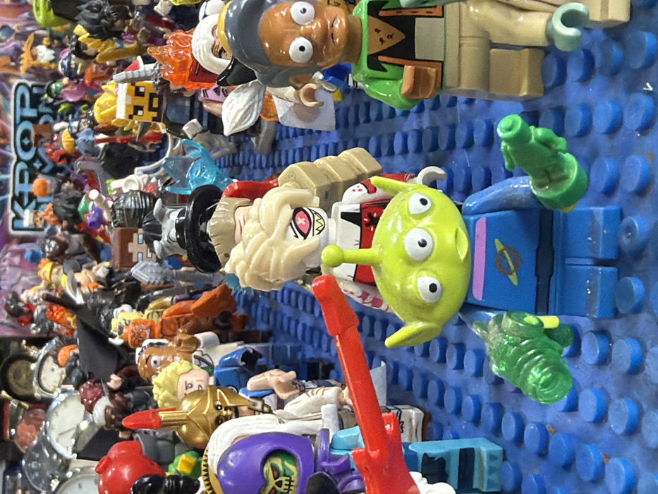A jumble of LEGO minifigures are affixed to a blue baseplate. Characters include a green alien from Toy Story, a Rick Sanchez minifigure, and a blonde-haired figure. A red toy guitar is angled upwards. The minifigures are densely packed, overlapping, and seemingly part of a larger display. The surrounding background features various other collectibles and a partial "KPOP" word.