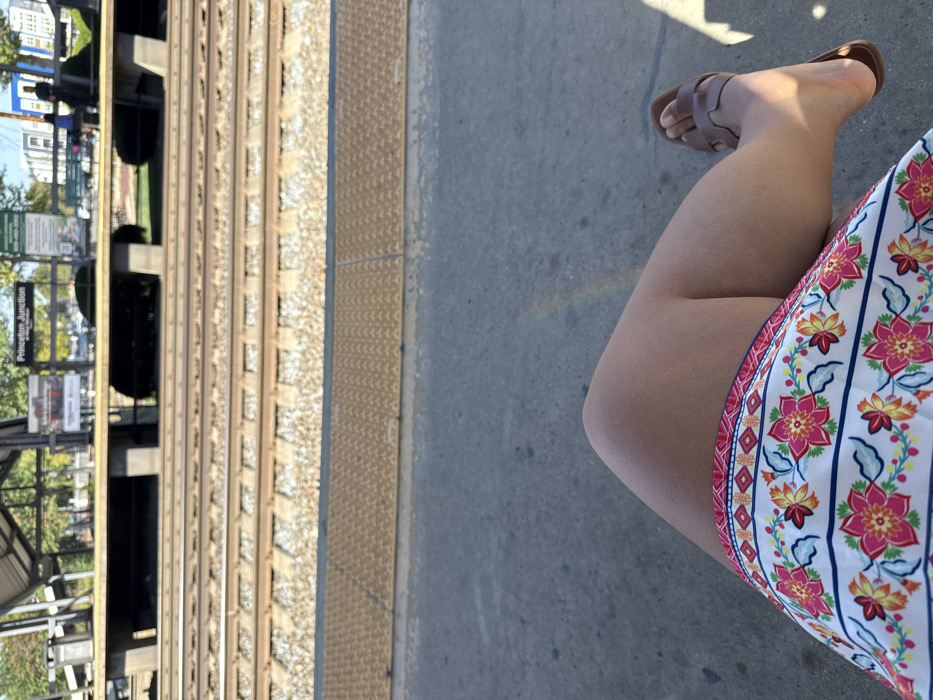 The image depicts a first-person view from a train station platform identified as Princeton Junction, located in West Windsor, United States. In the immediate foreground, the bare legs of an individual are visible, wearing a white skirt or dress with a distinct floral pattern featuring pink, yellow, and orange flowers with blue leaves. The right foot, partially visible, wears a brown open-toed sandal. A subtle, multi-colored light streak is present on the concrete platform surface near the center. Beyond the concrete, a textured yellow tactile warning strip runs along the platform edge. The midground features three visible sets of parallel train tracks, composed of metal rails on wooden ties embedded in light-colored gravel ballast. In the background, across the tracks, an opposing elevated train platform is present, featuring a covered structure supported by concrete pillars. A prominent sign on this far platform clearly reads "Princeton Junction." Several indistinct human figures are observable on the distant platform. Trees with green foliage are visible behind the far platform, and in the furthest background, urban or suburban buildings and vehicles are discernible beneath a clear blue sky. The scene is brightly illuminated by direct sunlight, casting shadows.