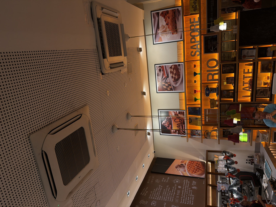 n interior space with a focus on the ceiling and adjacent wall. Two square ceiling-mounted air conditioning units are visible on a perforated white surface. Below the ceiling, a wall features framed pictures of desserts and decorative shelves with the words "SAPORE RIO LATTE". A menu board with the heading "CAFÉ DA MANDA" is also visible. The image is rotated to the left. A person stands at a counter.
