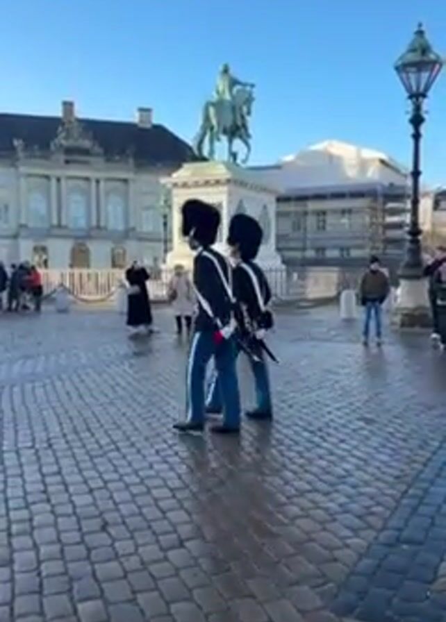 group of formally dressed guards marching in step across a cobbled square. The guards, numbering around five, are wearing black fur hats, blue and white uniforms, and carrying rifles with bayonets. They move in unison, their steps synchronized. Behind them, people are casually walking and standing around, some observing the guards. In the background, there is a statue of a person on horseback, a building with scaffolding, and a domed structure. The sky is clear and blue, suggesting it is daytime.