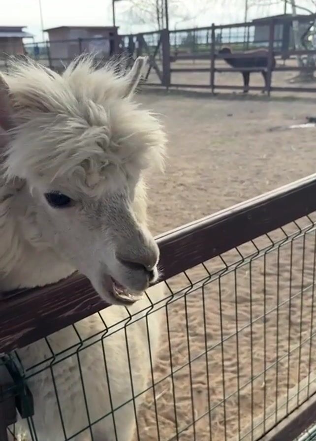 n alpaca standing near a metal fence, looking at the camera. The alpaca has a white, fluffy coat, and its head is close to the fence. A person's hand comes into frame, offering the alpaca a piece of orange vegetable. The alpaca takes the food from the person's hand. In the background, there is a dirt ground and another fenced area with an animal inside. There are some buildings and trees visible in the distance. The weather is bright and sunny.