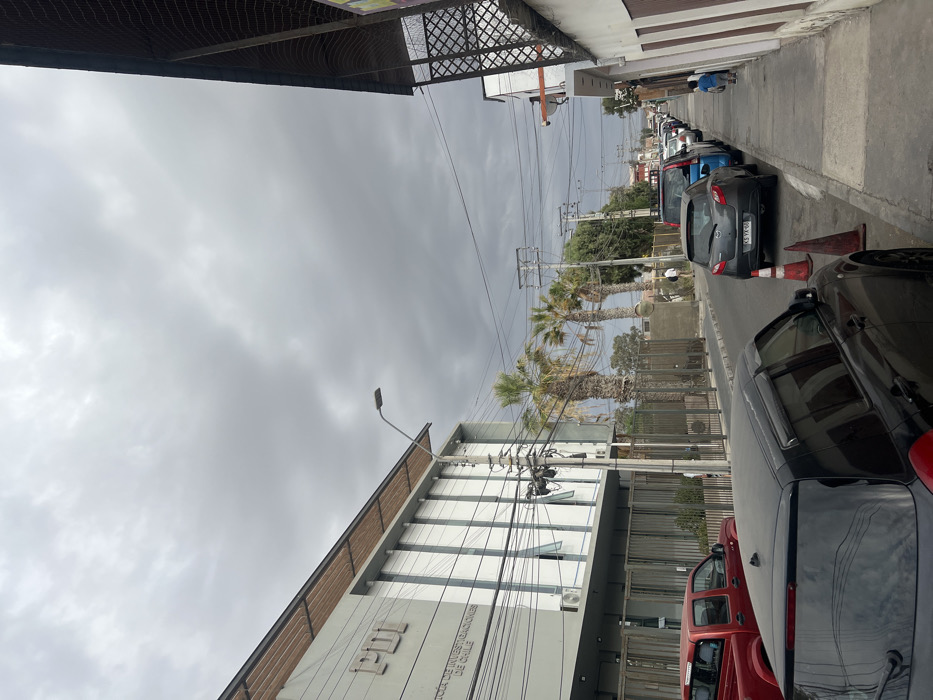 An overcast street scene with parked cars lining the right side. A light-colored building stands to the left, featuring utility poles with intertwined wires. Several palm trees rise along the street. The sidewalk is visible on the right, where a person sits near the parked cars. The sky is filled with gray clouds.