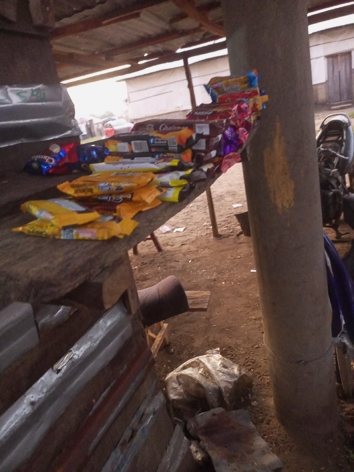 A makeshift table displays various snacks and candies under a weathered shelter. Packages of cookies and other treats are stacked haphazardly, with brands like "Chaiman" visible. The table is positioned next to a large support pillar. Debris and trash litter the ground around the area. A motorcycle is partially visible in the background, adding to the cluttered atmosphere.