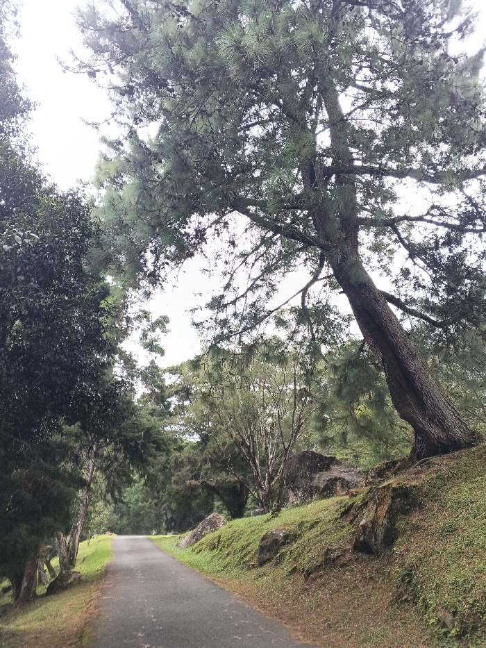 A winding paved road leads through a verdant landscape. Lush green foliage borders the path, including a large pine tree leaning over the road from a grassy, rocky embankment. The sky is overcast, creating soft lighting on the scene. The path disappears into the distance, flanked by trees and hinting at a peaceful journey.
