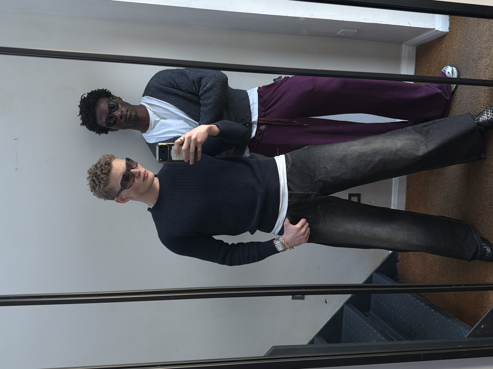 A mirror selfie captures two young men. The foreground figure, a fair-skinned male with curly blond hair, wears a black sweater over a white t-shirt, wide-leg dark gray jeans, sunglasses, and a watch on his left wrist, and holds a phone. Behind him is a dark-skinned male with black curly hair, dressed in a white t-shirt under a dark gray cardigan and dark purple pants. The reflection shows that they are standing in what appears to be an interior space, with a gray wall behind them and what appears to be stairs visible in the bottom right of the reflection. The environment suggests a possible urban setting, perhaps in a clothing store or residence, and the location is not identifiable as London, UK based on the visual information provided.