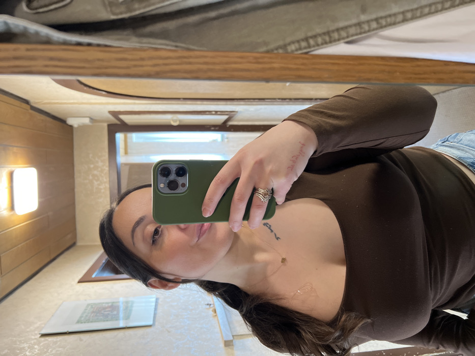 An indoor mirror selfie captures a female individual with dark hair, dark eyes, and a subtle smile