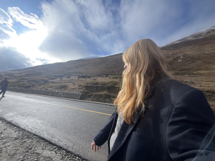The scene depicts a mountainous area within the city of Lhasa, China. In the foreground, the upper torso and head of a person with long, light reddish-blonde hair are visible, viewed from behind and the right side, looking towards the left. This individual wears a dark blazer over a light grey textured garment. A two-lane asphalt road, featuring a solid yellow center line and a broken white shoulder line, stretches from the foreground into the mid-ground, exhibiting a reflective surface. A low concrete barrier runs parallel to the road, separating it from an upward-sloping, barren hillside. In the mid-ground, on the left, a second person in dark attire walks along the gravel shoulder of the road. Further up the hillside, approximately five to seven dark bovine animals, consistent with yaks, graze among sparse vegetation and rocks. The background is dominated by a large, brown-hued mountain, with patches of snow visible on its distant upper sections. The sky above is partially cloudy, and bright sunlight is evident on the left, causing a light flare.