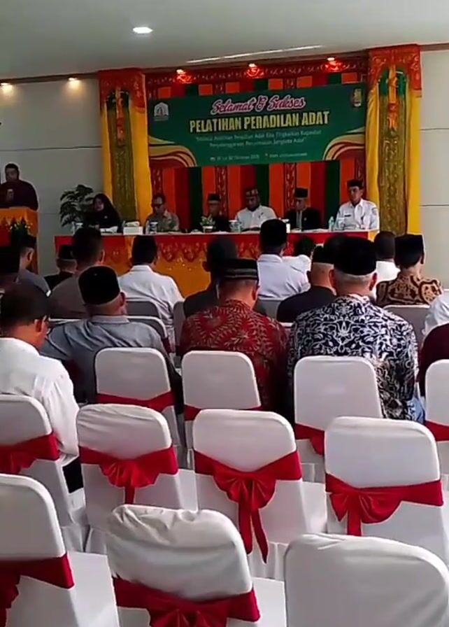 In an indoor room, a conference or training event is taking place. White chairs, adorned with red ribbons, are arranged in rows facing a stage. On the stage, a group of individuals sits behind a table, while a presenter stands at a lectern, speaking to the audience. A projector screen displays the title "Pelatihan Peradilan Adat", which translates to "Customary Justice Training". The room is well-lit and appears to be set up for a formal gathering.