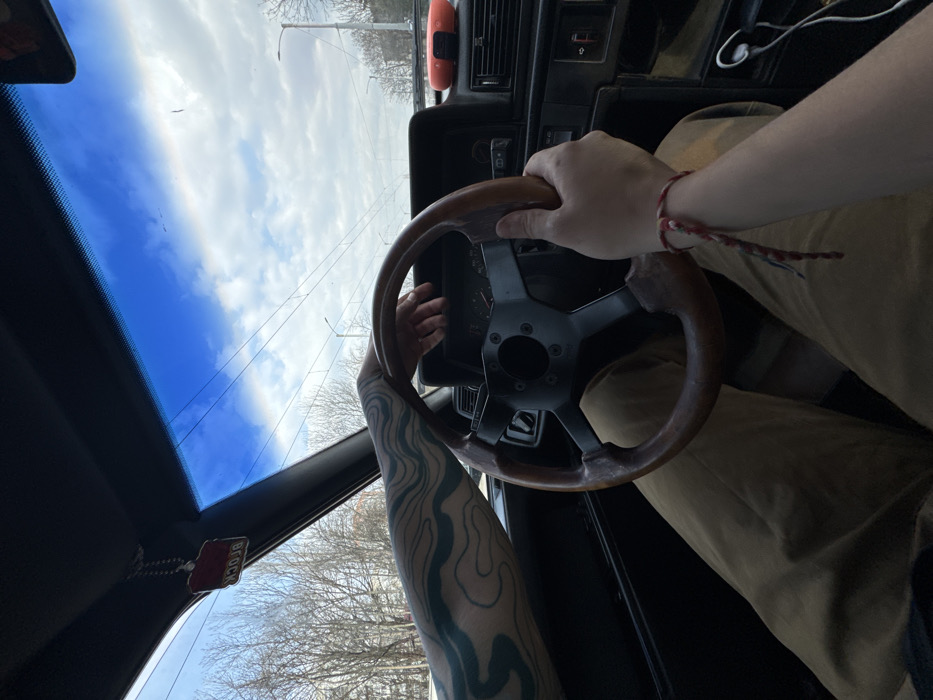 Inside a vehicle, a first-person perspective captures the interior and exterior through the windshield. Two individuals are present: a driver whose left arm, extensively tattooed with a flowing teal design, grips a wooden-rimmed, three-spoke steering wheel at the 9 o'clock position. A passenger's right hand, adorned with a braided red and white bracelet, also grips the steering wheel at the 3 o'clock position. The passenger wears light brown pants, visible below the steering wheel. The vehicle's dashboard is dark, featuring visible air vents and partially obscured gauges. An orange portable speaker rests on the dashboard to the right. White charging cables are visible near the passenger's right leg. From the rearview mirror stem, a red and black rectangular air freshener with "BLOCK" written in white hangs. Beyond the windshield, the sky is partly cloudy with patches of blue. Numerous overhead utility wires crisscross the view, alongside bare deciduous trees suggesting a colder season. Utility poles and streetlights are visible in the distance, indicating an urban or suburban setting within the city of Unknown, Unknown. The vehicle appears to be in motion or stationary on a road.