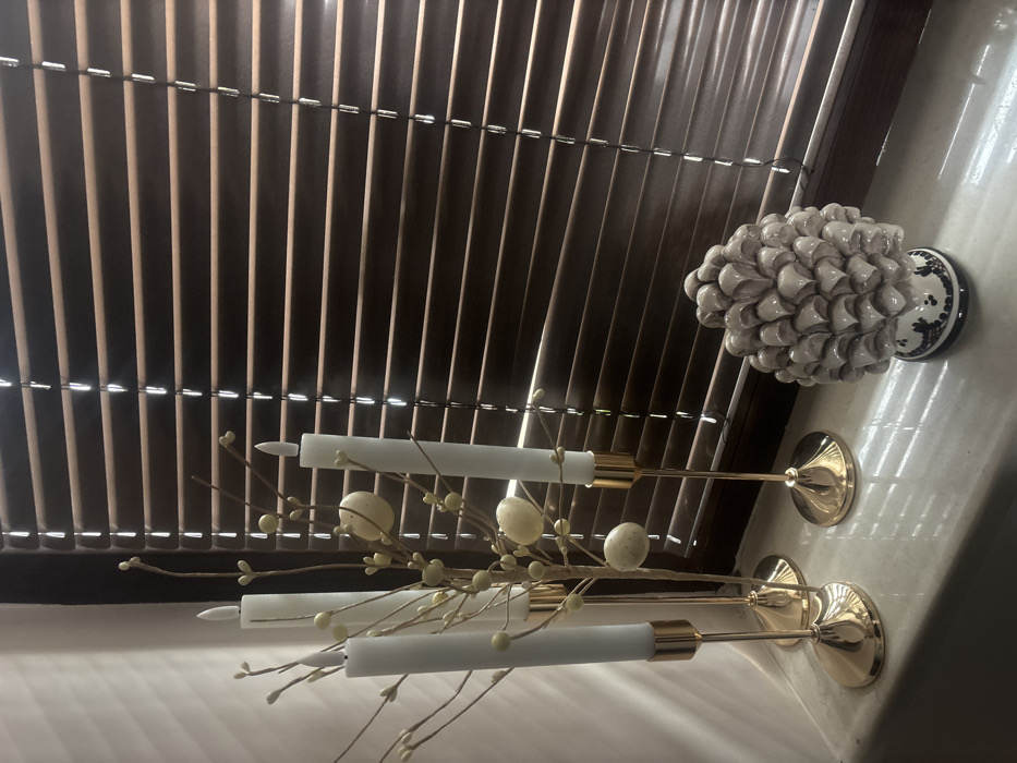 The scene depicts an interior setting, specifically a windowsill or shelf within a building in Razgrad, Bulgaria. Positioned on a white surface, three golden-colored metal candle holders of varying heights stand centrally. Each holder supports a slender, white, battery-operated LED candle featuring a simulated flickering flame tip. Interspersed among the candles are decorative bare branches adorned with numerous small, light-yellow spherical buds and several larger, light-cream, egg-shaped ornaments. To the right of this arrangement rests a decorative ceramic or terracotta sculpture shaped like a large pinecone, exhibiting a light gray hue with pronounced, overlapping scales. This pinecone sculpture sits on a small, rounded base decorated with a white background and dark blue patterns, including dots and floral motifs. The background features a window covered by horizontal brown wooden blinds, which are mostly closed, allowing streaks of natural light to penetrate and cast parallel lines of light and shadow across the blinds and the displayed items. No people, discernible actions, or interactions are present in the image.