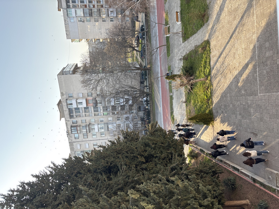 This image depicts an outdoor scene in Pazardzhik, Bulgaria, under clear daylight, characterized by long shadows suggesting late afternoon or early morning sun. In the immediate foreground, a group of approximately 10-12 individuals, primarily young adults or teenagers, walk away from the camera on a grey paver walkway bordered by a dense line of tall coniferous trees on the left. Most individuals wear dark, casual clothing. Long, distinct shadows are cast across the pavement to the right. To the right of the walkway, a patch of green grass contains a small, bare deciduous tree and a conical evergreen shrub. The midground features a further paved area with two light-colored wooden benches; one bench is occupied by a single person. Beyond this, a red athletic track with visible lanes stretches horizontally. Adjacent to the track runs a street where approximately 5-7 dark-colored vehicles are parked. Along this street, a significant gathering of people, estimated to be 50-100 individuals, stands in a crowd, facing towards the left, appearing to observe an event or activity. Several bare deciduous trees are scattered throughout the midground. The background is dominated by multiple multi-story, grey concrete apartment buildings, characteristic of residential architecture, with numerous windows and balconies, some enclosed. A clear, pale blue sky occupies the upper portion of the frame, against which a flock of numerous small birds is visible in flight.