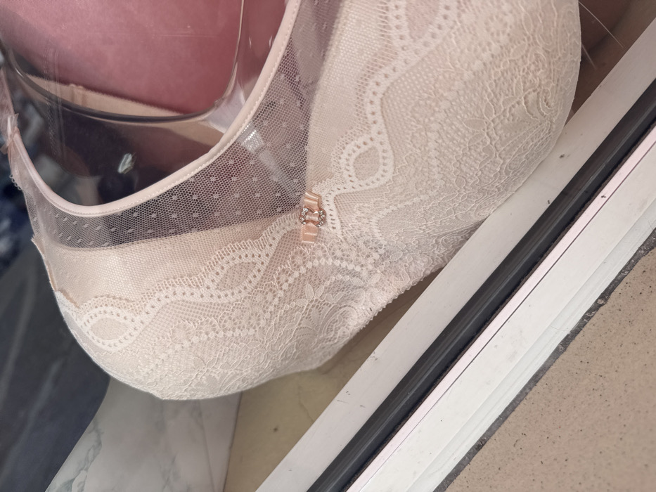 A close-up, angled view depicts a light beige or cream-colored brassiere displayed within a storefront window in Burgas, Bulgaria. The brassiere features intricate lace patterns over a solid base fabric, with the upper cup sections constructed from a sheer, polka-dotted mesh material. A small, light peach-colored ribbon bow, centered with a rectangular, clear-gemmed buckle, is positioned at the garment's center gore. The brassiere is partially supported by a clear plastic form, visible within the right cup. The lower portion of a white window frame with a dark gray sealing strip traverses the image's bottom third. Below this frame, a section of light gray, coarse-textured pavement is visible. Reflections on the window surface include a blurry, possibly marbled white and gray pattern in the upper left corner and indistinct dark areas within the store behind the brassiere.