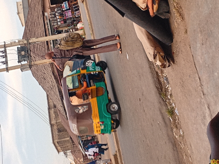 A street scene is captured from an elevated angle. A three-wheeled auto-rickshaw in green and brown is moving on the asphalt road. A man in brown attire stands near the auto-rickshaw, carrying a backpack. Behind him, a building with a brown rooftop is visible, with power lines and a transformer nearby. The sidewalk appears cracked, with some vegetation growing in the crevices. The background shows a street lined with shops and people.