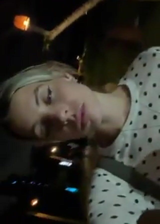 A woman with blonde hair and a white, polka-dotted shirt holds a camera and is outdoors at night. Lights illuminate the area behind her. She makes exaggerated facial expressions at the camera, like pursing her lips and widening her eyes. Someone walks behind her.