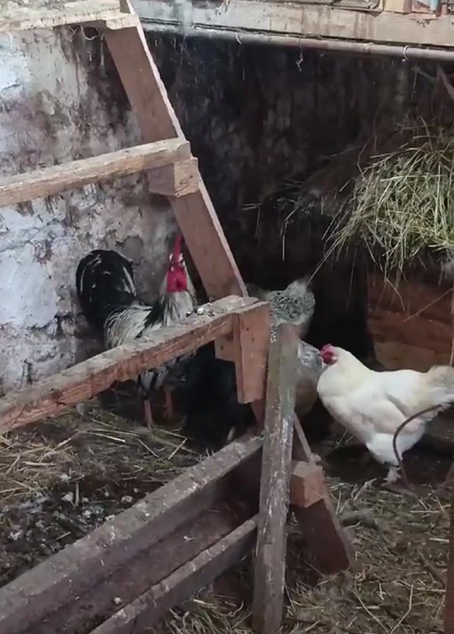 chicken coop in what appears to be a weathered, aged structure. Inside, a rooster with black and white plumage stands near a makeshift wooden ladder, while three hens, one white and two speckled, forage in the straw-covered floor. Behind them is a dark space, filled with hay or straw. The rooster crows loudly. The building's wall is visible with peeling paint and a window with a wire mesh covering. The scene is enclosed, and the lighting is dim.