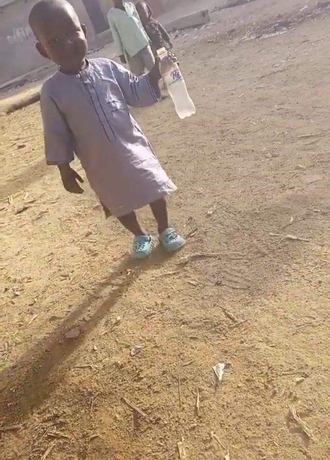 A small boy is standing in a dirt yard, holding a plastic bottle labeled "Pop" in his right hand