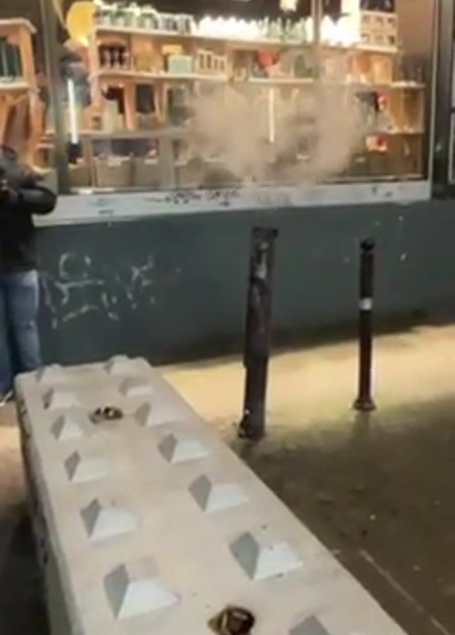 A person wearing a cap, dark jacket, and jeans stands on a wet, paved sidewalk in front of a shop. The shop has a large front window displaying shelves filled with various items. The person stands with their hands close to their chest. Behind the person, a grey concrete barrier is visible, marked with red paint. Behind the barrier, two bollards stand on the sidewalk. A cloud of white dust or smoke appears inside the shop. The person seems to observe what is happening inside the store. The scene is dimly lit, suggesting it is nighttime.