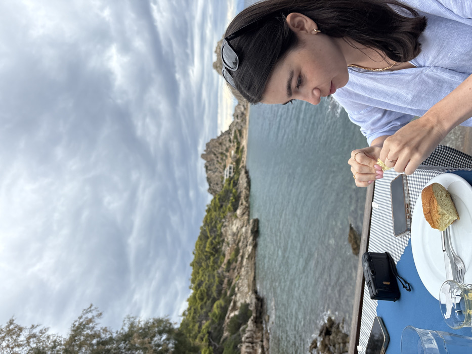 The image captures an adult female seated at an outdoor table beside a body of water in the Municipal Unit of Loutraki - Perachora, Greece, under an overcast sky