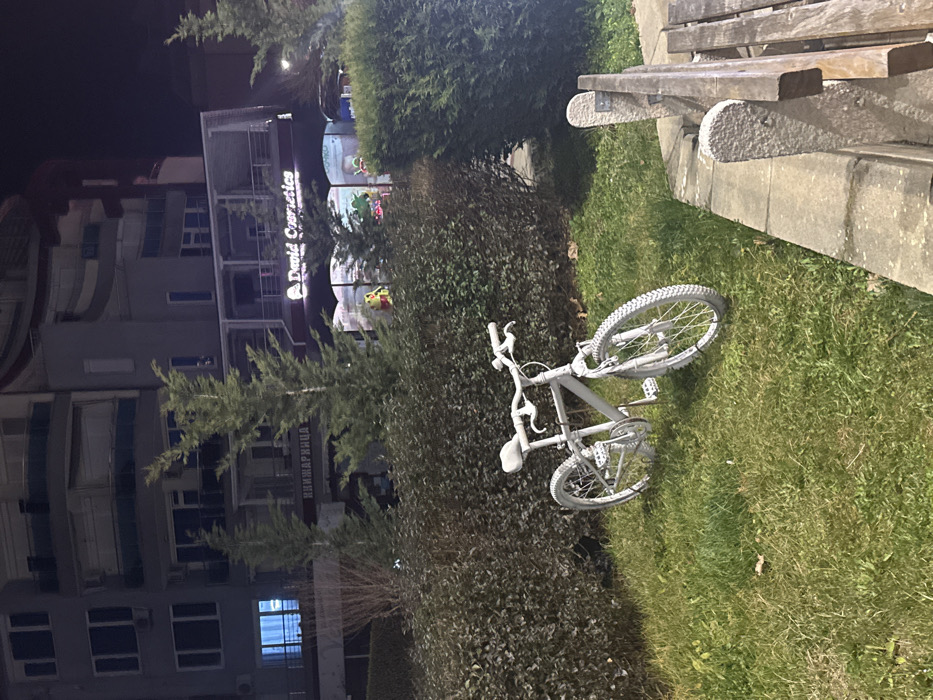 This image depicts a nighttime urban scene in Primorsko, Bulgaria. In the foreground, a white-painted bicycle stands upright on a patch of green grass. To the immediate right, a section of a wooden park bench with two stone supports is visible. A dense, dark green hedge separates the grassy area from the background. Behind the hedge, several slender evergreen trees are positioned in front of a multi-story building. This building features multiple illuminated windows and balconies. At street level beneath the main structure, an illuminated sign for "David Cosmetics" is visible above a storefront displaying colorful figures. To its left, a partially obscured sign with Cyrillic text reading "ВИНАРНИЦА" (Winery) is present. The scene is illuminated by artificial light sources from the buildings and shop signs. No individuals are observed within the frame.