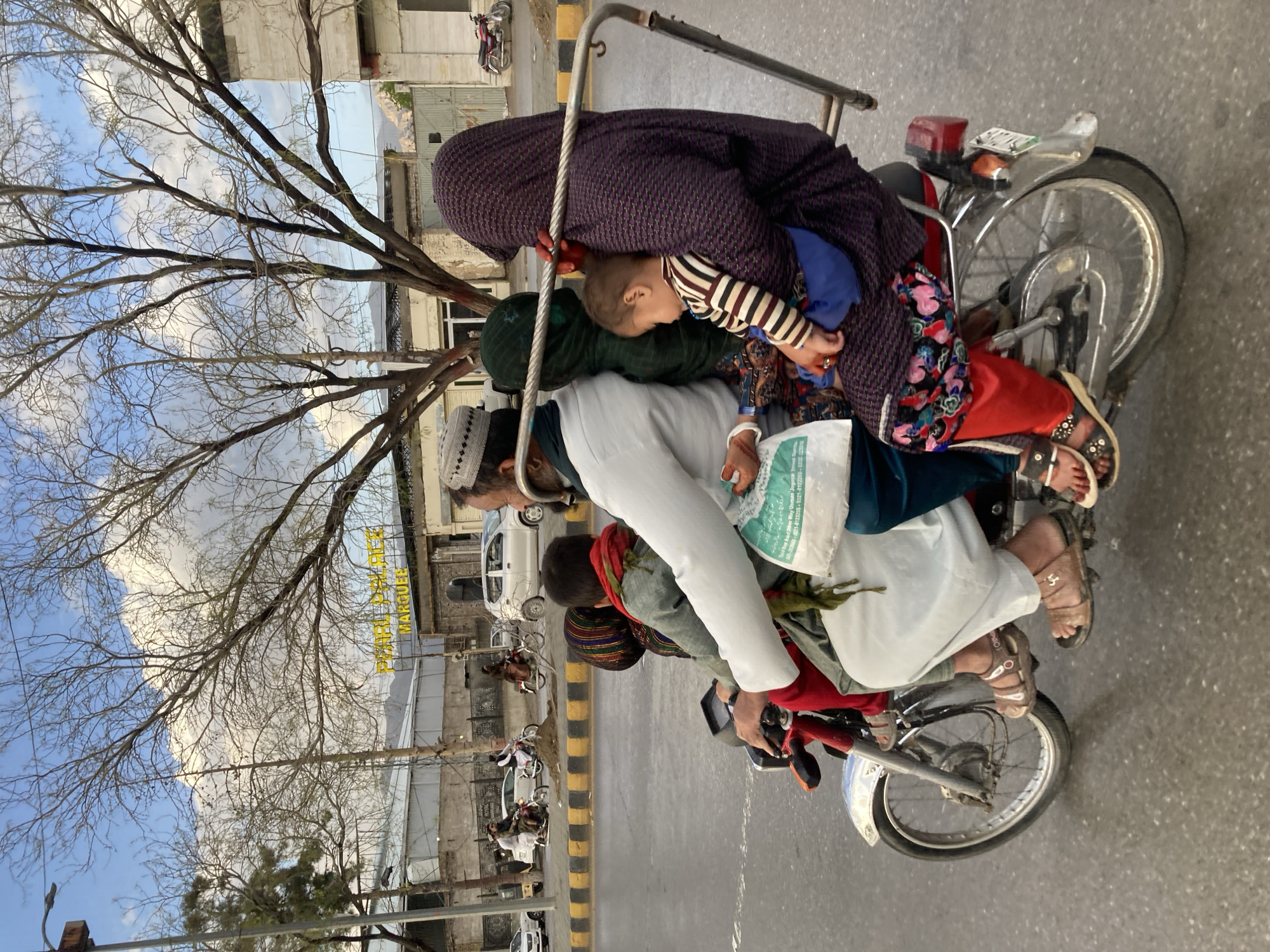 An overloaded red and silver motorcycle carrying five individuals travels on a paved road in Quetta City Tehsil, Pakistan. The driver, an adult male with a beard wearing a white shalwar kameez and a patterned cap, operates the vehicle. In front of him sits a child wearing a red scarf and grey garment. Behind the driver, an adult female with a dark green head covering is seated. Behind her, a second adult female wearing a dark purple patterned burqa/abaya, red pants, and black sandals is positioned. She cradles a sleeping infant/toddler in a striped shirt and blue pants. The motorcycle features a metal frame extension behind the rearmost passenger. A white plastic bag with green Urdu text hangs near the handlebars. The road has a yellow and black striped median. In the background, a large sign reads "PEARL PALACE MARQUEE" in yellow lettering. Numerous trees with bare branches are visible, suggesting winter or early spring. Several other vehicles, including cars and motorcycles, are present on the street. Mountains are visible on the distant horizon under a sky with scattered white clouds.