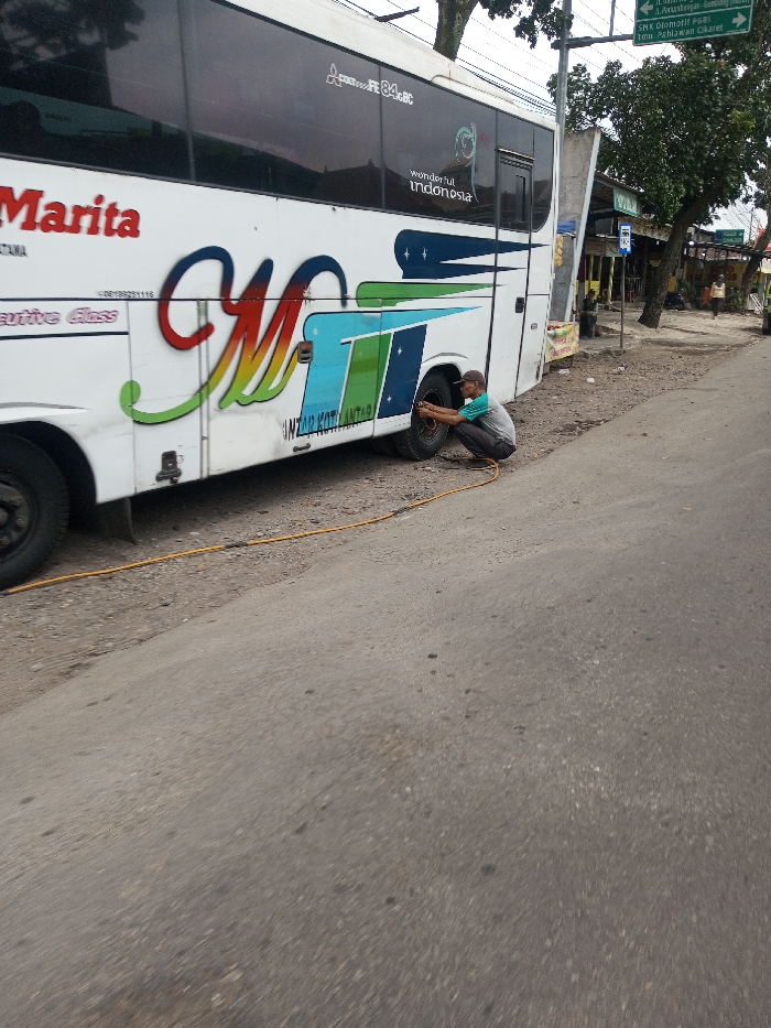 A white "MARITA Executive Class" passenger bus is stationary on the unpaved shoulder of a road in Khajuripada, India. A male individual, wearing a light-colored long-sleeved shirt, dark pants, and a baseball cap, is crouched next to the bus's front passenger-side wheel. He is actively attending to the tire, holding a yellow air hose connected to the valve stem, appearing to inflate or check the pressure. The bus features a large, stylized "M" logo in red, green, and blue, and "wonderful indonesia" branding. The adjacent road is asphalt. In the background, a green overhead road sign displays text in a non-English language (Indonesian, mentioning locations like Cikaret and Purwokerto), supported by a grey pole. Several trees with green foliage line the roadside, and indistinct structures are visible further back. The scene is illuminated by diffused daylight.