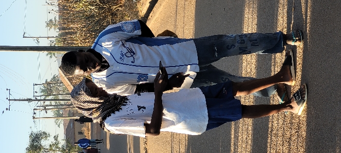 Two people stand on a paved surface under bright sunlight, one taller individual in a white and blue baseball jersey and jeans, and the other shorter individual in a white t-shirt, blue shorts, and a patterned head covering. The shorter person holds a phone. Power lines extend into the distance above foliage, and a few distant figures are visible. Shadows are cast on the ground.