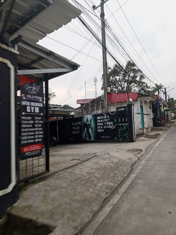 This image depicts a street scene in Kheda, India, under an overcast sky. In the foreground, a concrete pathway, exhibiting cracks and wear, leads into a commercial property. To the left, a black metal gate with a corrugated metal awning displays a banner for "EVOLUTION FITNESS OPEN MEMBER GYM," detailing membership information. Further inside the property, a larger black metal sliding gate features a graphic of a muscular figure alongside text reading "SHAPE YOUR BODY" and "BEHIND A HEALTHY SOUL THERE IS A STRONG BODY." To the right of the entrance, an asphalt road slopes gently uphill. A prominent utility pole, densely covered with numerous black electrical and communication wires, stands in the midground, with a street light affixed to it. Behind the pole and gates, several buildings are visible, including a white structure with a red roof section and another with a light blue door. A red scooter is parked further down the street on the right. In the background, a cellular communication tower is discernible, along with various trees and sparse vegetation. No individuals are present or engaged in activities within the frame.