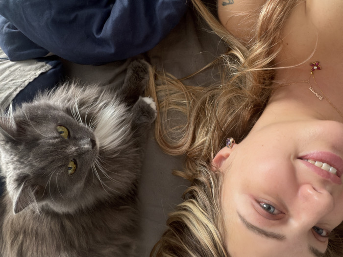 The image portrays a close-up scene featuring a female subject and a domestic cat, situated in what appears to be an indoor setting in Большая Шильна, Russia. The female, positioned on her back with her head slightly angled, presents a direct gaze and a smile, revealing her teeth. She has long, blonde and light brown hair spread across a dark surface. Her visible features include blue eyes, clear skin, and the presence of small hoop earrings with faceted stones on her right ear. A delicate gold-colored necklace with a small nameplate and a red floral pendant adorns her neck. A portion of a tattoo is visible on her left shoulder. Adjacent to the female, a long-haired gray cat with white markings on its chest and paws is lying, with its green-yellow eyes directed towards the female. The cat is resting on a crumpled dark blue blanket or duvet. The overall lighting is soft and uniform, illuminating both subjects.