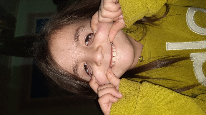 A young child with dark brown hair is centered, depicted from the chest up, making a playful facial expression