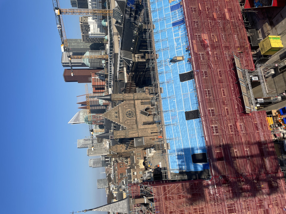 This image presents an elevated view of the city of The Hague, Netherlands, under clear blue skies. The central focus is a historical building, identifiable as part of the Binnenhof parliamentary complex, currently undergoing extensive renovation. In the immediate foreground, a significant portion of this building is enveloped in red construction scaffolding and protective netting. The roof of this section is covered with bright blue tarpaulins or waterproof sheeting, marked with white grid lines. Multiple rectangular dark apertures are visible on this blue surface. Small figures, consistent with construction workers, are observed on the blue roof covering and within the scaffolding, indicating active work. A distinct shadow, originating from an unseen structure, is cast diagonally across the lower left section of the scaffolded building. At the bottom center, a temporary construction entrance or tunnel, also framed by scaffolding, leads into the building. Adjacent to this entrance are various construction materials, including blue bins and a yellow container. In the midground, beyond the heavily scaffolded structure, the prominent gothic-style Ridderzaal (Knight's Hall) of the Binnenhof is clearly visible, constructed from brown brick or stone, featuring a large circular rose window on its facade and several pointed turrets. Other historical buildings with dark, pitched roofs are arrayed around the Binnenhof. The steeple of another older building rises on the far left. The background reveals a modern urban skyline dominated by numerous high-rise buildings of contemporary architectural design, including glass-fronted towers and structures with patterned facades. Several tall yellow and red construction cranes are conspicuously present against the sky, indicating ongoing development in the wider city area. The sky itself is uniformly clear and bright blue, suggesting fair weather conditions.