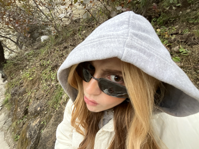 A close-up, eye-level self-portrait captures a young female individual outdoors in a natural, rugged environment within Huairou District, China. The individual wears a light grey hooded sweatshirt with the hood pulled up, obscuring most of the head, and a lighter-colored jacket or coat. Long, light-colored hair is visible beneath the hood. Black-framed sunglasses are positioned on the face, slightly askew, allowing the individual's right eye to be visible and directed towards the camera. The mouth is pursed. The background consists of a sloping terrain featuring exposed earth and rocks, sparsely covered with deciduous vegetation displaying some reddish-brown autumn leaves and patches of green ground cover.