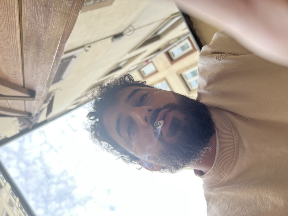 A low-angle selfie captures a male individual from the chest up, with dark curly hair and a full beard, looking directly at the camera