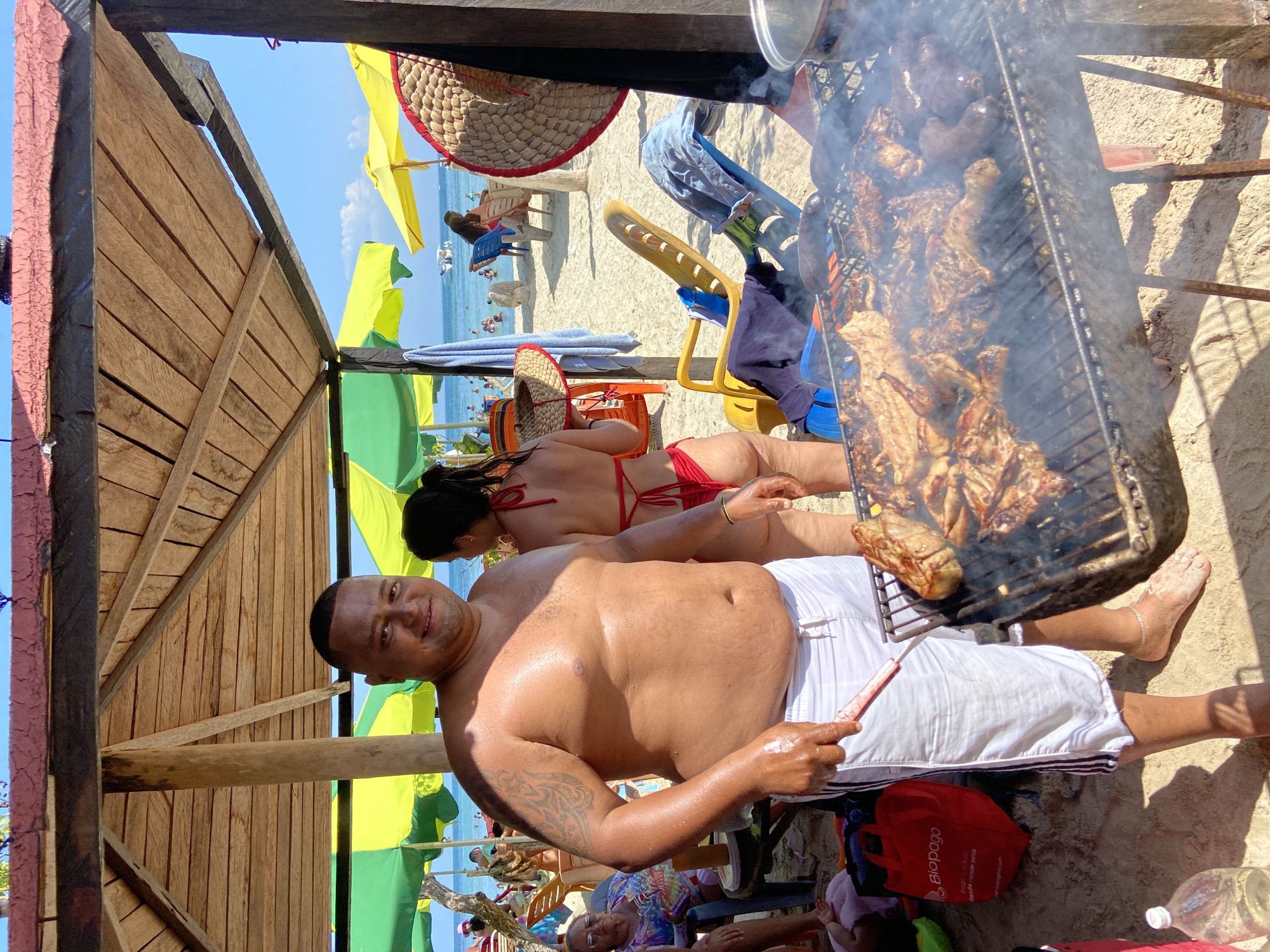 The image depicts a man grilling food at a beach in Los Totumos, Venezuela