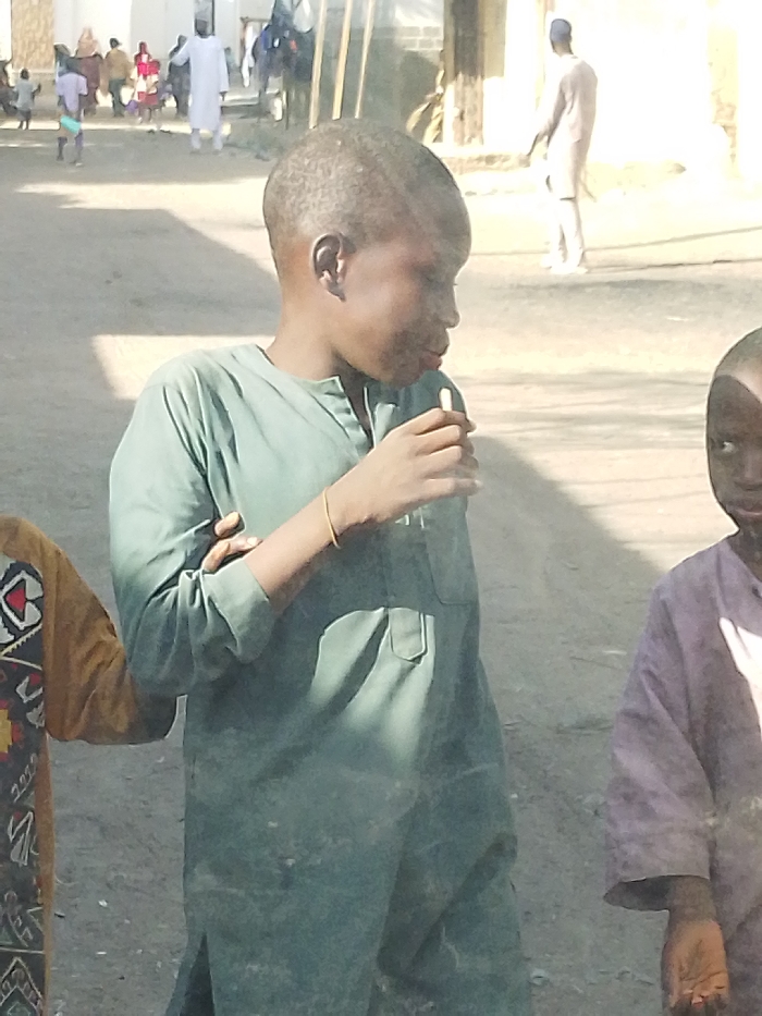 A young person wearing a green outfit is looking off to the side. They are holding something small in their hand near their mouth. A gold bracelet adorns their wrist. Another child stands nearby in a purple shirt. In the background, a group of people, some in white robes, are walking along a road. A person on horseback is also visible. The scene appears to be outside on a sunny day.