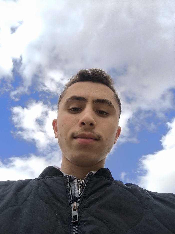 A close-up image taken in Jirud, Syria, depicts a young male from the chest upward against a sky backdrop. The subject, positioned centrally, has short, dark, curly hair, pronounced eyebrows, and a visible light mustache. He wears a dark, possibly black, quilted jacket with a silver-colored zipper that is partially unzipped, revealing an underlying light-colored collar. His gaze is directed towards the camera, and his expression is neutral. The background consists of a clear blue sky interspersed with white cumulus clouds, indicating an outdoor setting with an upward camera angle. No other individuals or distinguishing objects are present.